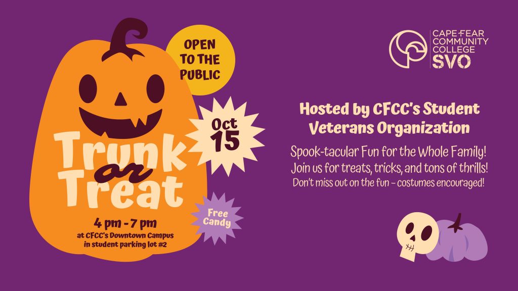 Wilmington, NC (October 8, 2025) – Cape Fear Community College’s Student Veterans Organization invited the community to attend a free, family-friendly Trunk-or-Treat event on Wednesday, October 15, 2025, from 4:00 to 7:00 p.m. at CFCC Downtown Campus.