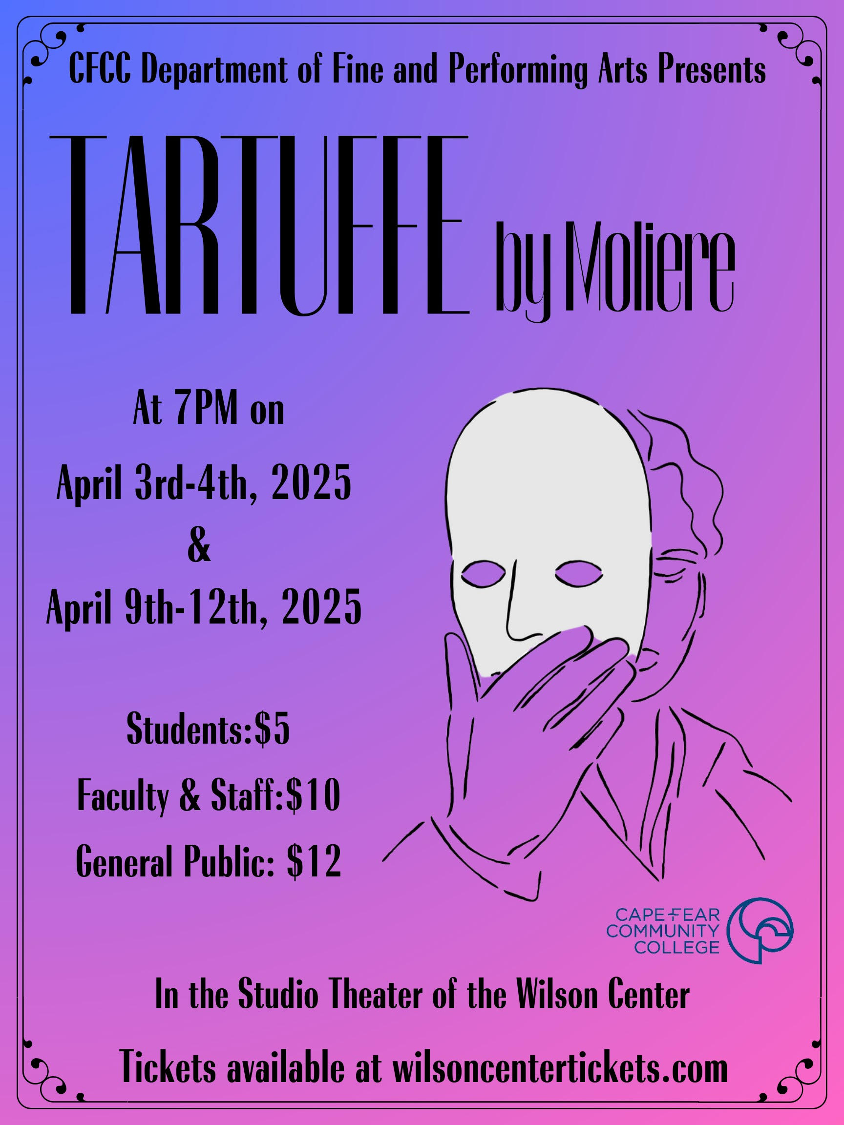 Written by 17th-century French playwright Molière, Tartuffe is a timeless satire that explores themes of hypocrisy, deception, and the clash between appearance and reality. This production will showcase the talents of CFCC’s student performers and production team, offering audiences a fresh and engaging take on the comedic masterpiece.